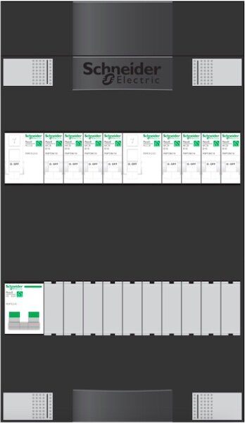 Schneider Resi9 XE 1-fase groepenkast 8 groepen van Schneider Electric — Franse elektrotechniek-gigant. Resi9 en Acti9 zijn premium lijnen met innovaties zoals VisiSafe status-indicator (fysiek zichtbaar of een automaat aan/uit staat).